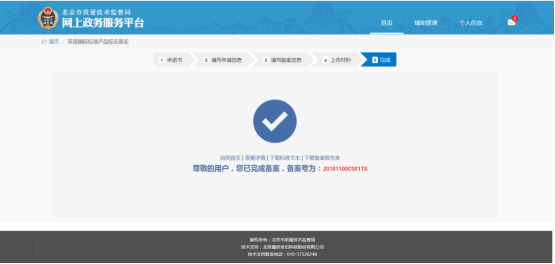 界面顯示“尊敬的用戶您已完成備案,備案號為********”并且可以點(diǎn)擊“回到首頁”、“查看詳情”、“下載標(biāo)準(zhǔn)文本”、“下載備案報(bào)告表”。