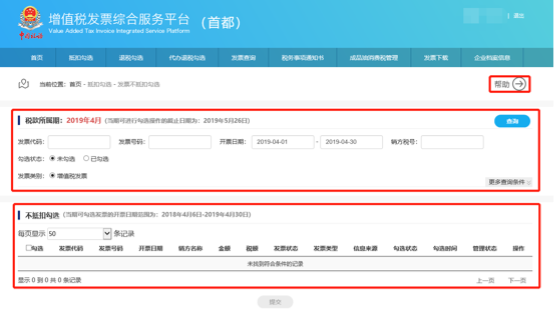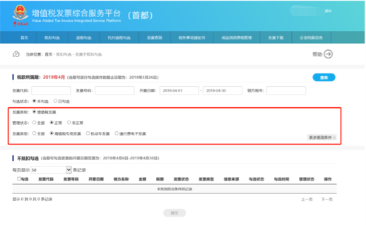 在此功能中分為上、下兩個(gè)區(qū)域,即查詢條件區(qū)域和發(fā)票查詢結(jié)果勾選操作區(qū)域。