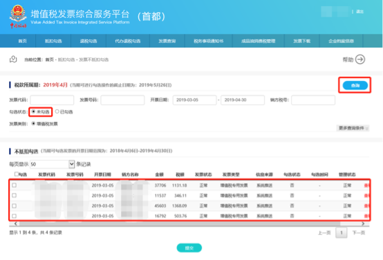 默認(rèn)查詢勾選狀態(tài)為“未勾選”的發(fā)票。點(diǎn)選“已勾選”則篩選出當(dāng)前稅款所屬期已勾選的發(fā)票。 |