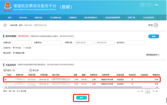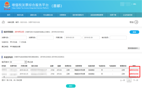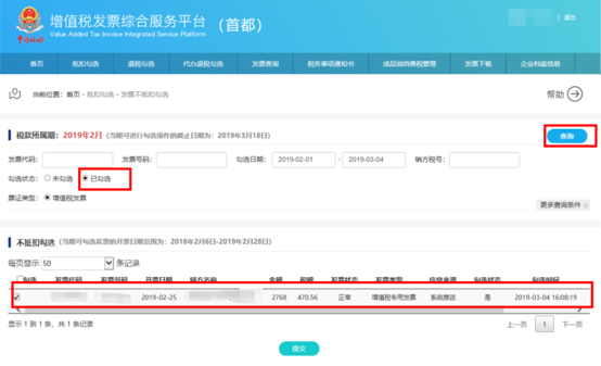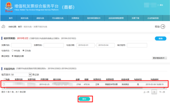 (4)數(shù)據(jù)提交成功,提示如下圖,此時(shí),在操作中去掉對(duì)勾的發(fā)票狀態(tài)就變?yōu)榘l(fā)票不抵扣未勾選狀態(tài),可進(jìn)行重新勾選.