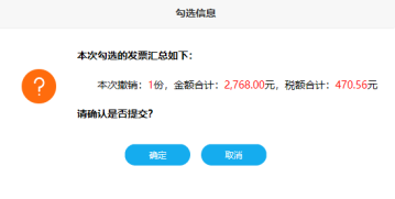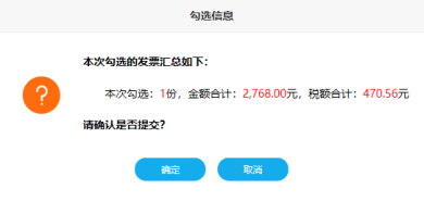 (2)用戶根據(jù)查詢結(jié)果選擇發(fā)票進(jìn)行不抵扣勾選操作,確認(rèn)本次需要勾選的發(fā)票全部勾選完成后,可以點(diǎn)擊“提交”按鈕,彈出勾選認(rèn)證信息對(duì)話框如下: