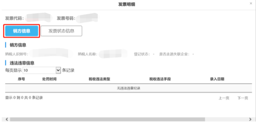 (2)銷方信息頁面包括該發(fā)票的銷方信息和違法違章信息,如下圖: