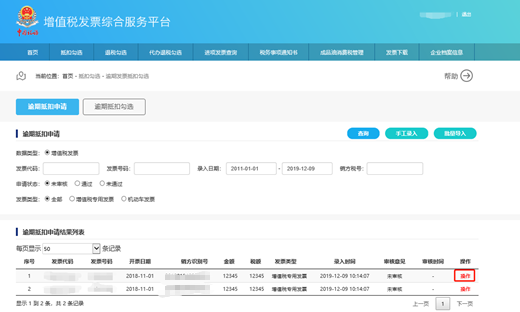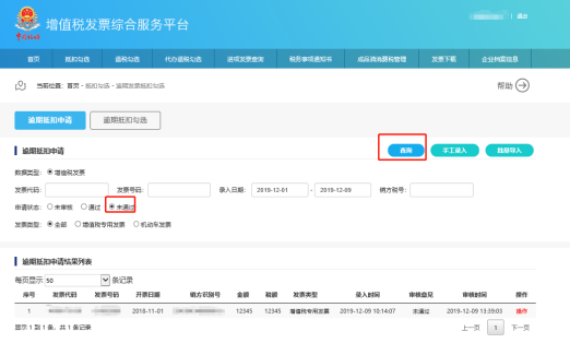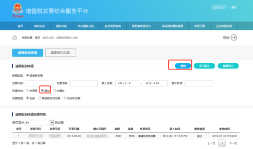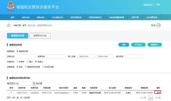 選擇申請狀態(tài)(未審核、通過、未通過)后錄入發(fā)票代碼、發(fā)票號(hào)碼、開票日期以及銷方稅號(hào)就可在“逾期抵扣申請結(jié)果列表”中查看逾期發(fā)票抵扣申請的處理狀態(tài)。如下圖顯示: