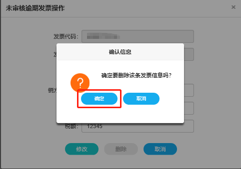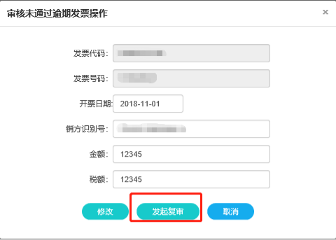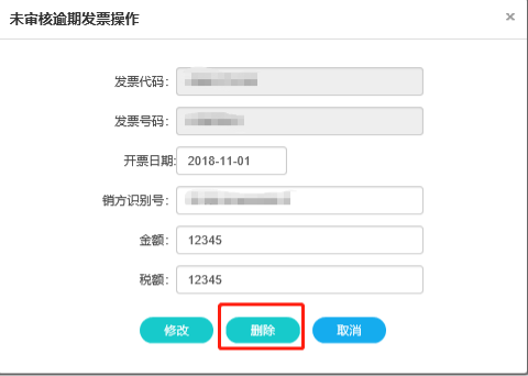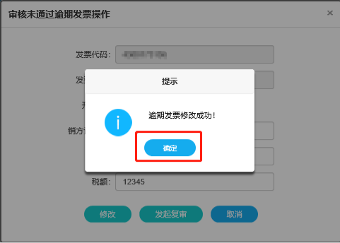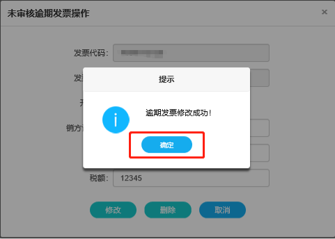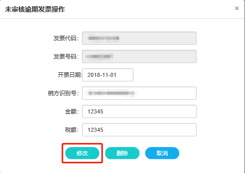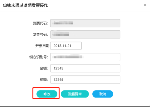 彈出窗口后可對(duì)開票日期、銷方識(shí)別號(hào)、金額和稅額進(jìn)行修改,修改后點(diǎn)擊‘修改’