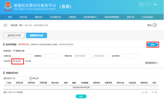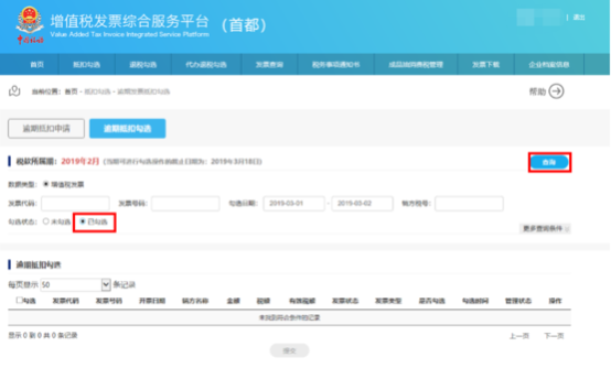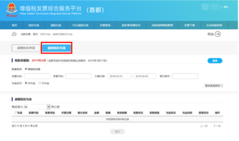 系統(tǒng)默認(rèn)為逾期抵扣申請頁面,可通過點(diǎn)擊“逾期抵扣勾選”按鈕和“逾期抵扣申請”按鈕,進(jìn)行頁面切換。