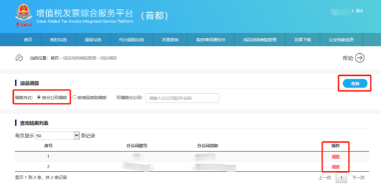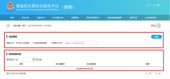 (1) 在調(diào)撥方式選擇“按分公司調(diào)撥”、可調(diào)撥分公司下拉框中選擇對(duì)應(yīng)的分公司,點(diǎn)擊“查詢”按鈕: