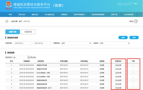 (2)申請(qǐng)?zhí)幚磉M(jìn)度明細(xì)會(huì)詳細(xì)顯示所有符合條件的發(fā)票下載申請(qǐng)的處理狀態(tài):