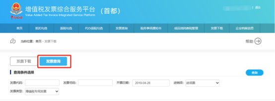 1、點(diǎn)擊頁(yè)面“發(fā)票查詢(xún)”切換到發(fā)票查詢(xún)功能頁(yè)面,如下圖所示: