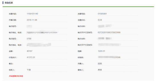3、根據(jù)錄入條件,查詢(xún)到的發(fā)票信息顯示如下圖所示,點(diǎn)擊頁(yè)面主票面下方的“查看貨物信息”,可以查看該發(fā)票對(duì)應(yīng)的貨物明細(xì)信息。