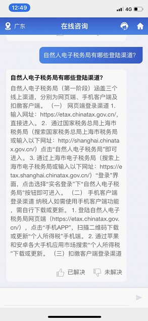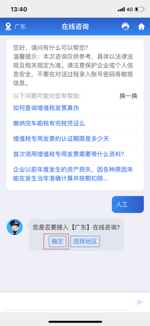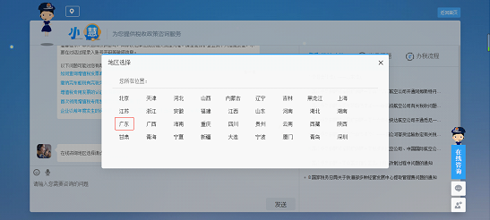 以廣東省為例,如需咨詢廣東地區(qū)(除深圳外)的涉稅費(fèi)問題,請根據(jù)以下指引注冊賬號進(jìn)行登錄,請選擇“廣東”進(jìn)入人工在線咨詢。如下圖: