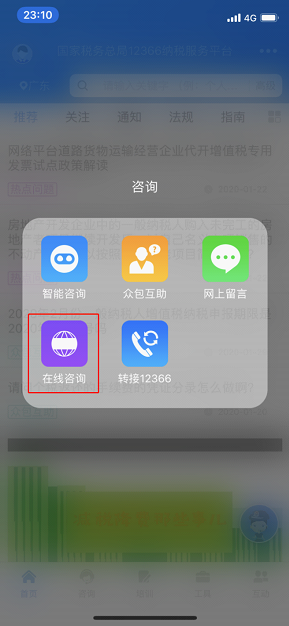 安卓用戶可通過應(yīng)用市場或者應(yīng)用商店下載國家稅務(wù)總局“12366納稅服務(wù)”APP;蘋果用戶可通過APP Store進(jìn)行下載。在應(yīng)用界面點(diǎn)擊“咨詢”模塊,然后選擇“網(wǎng)上留言”或者“在線咨詢”等欄目進(jìn)行咨詢。如下圖:
