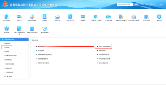 (1)納稅人登錄寧夏電子稅務(wù)局進(jìn)入方式:點(diǎn)擊【我要辦稅】—【稅費(fèi)申報(bào)及繳納】—【其他申報(bào)】—【城鎮(zhèn)土地使用稅】