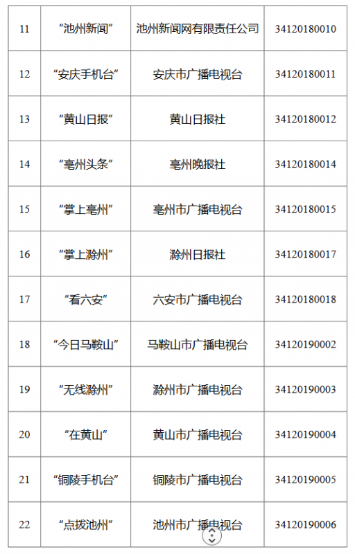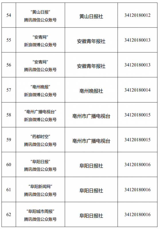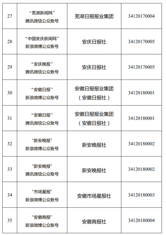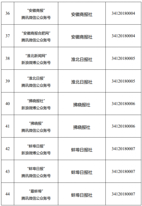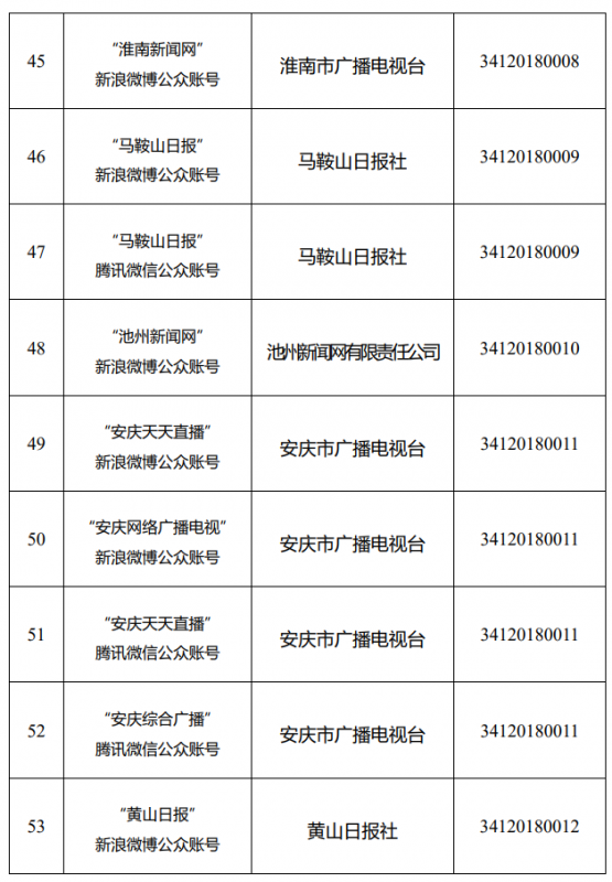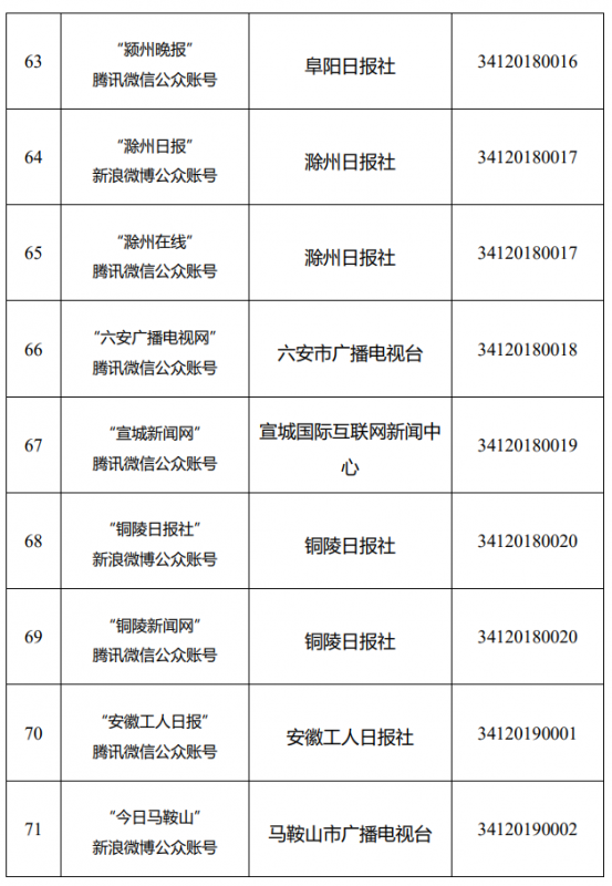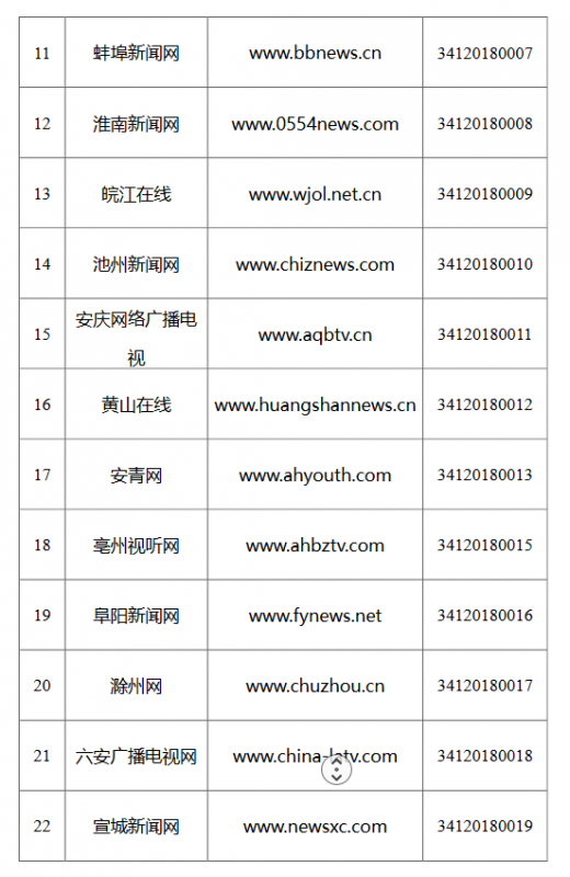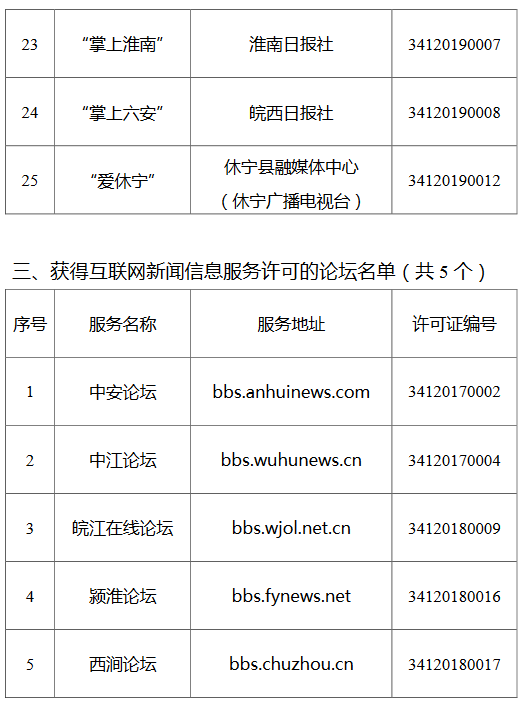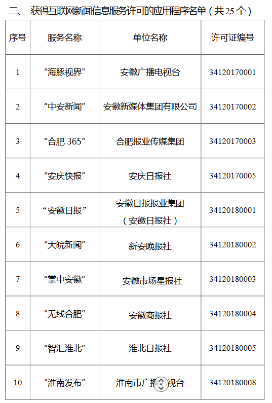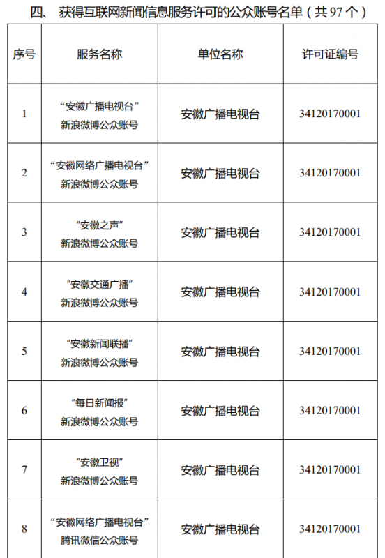 截至2019年12月26日,經(jīng)安徽省互聯(lián)網(wǎng)信息辦公室審批的互聯(lián)網(wǎng)新聞信息服務(wù)單位總計37家,具體服務(wù)形式包括:互聯(lián)網(wǎng)站34個,應(yīng)用程序25個,論壇5個,公眾賬號97個,共計161個服務(wù)項。