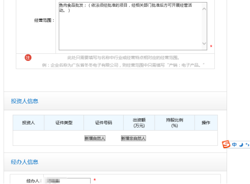 錄入企業(yè)的住所、注冊資本、經(jīng)營范圍、股東、經(jīng)辦人等相關(guān)信息;系統(tǒng)會根據(jù)選擇的企業(yè)類型顯示需填寫的不同信息。
