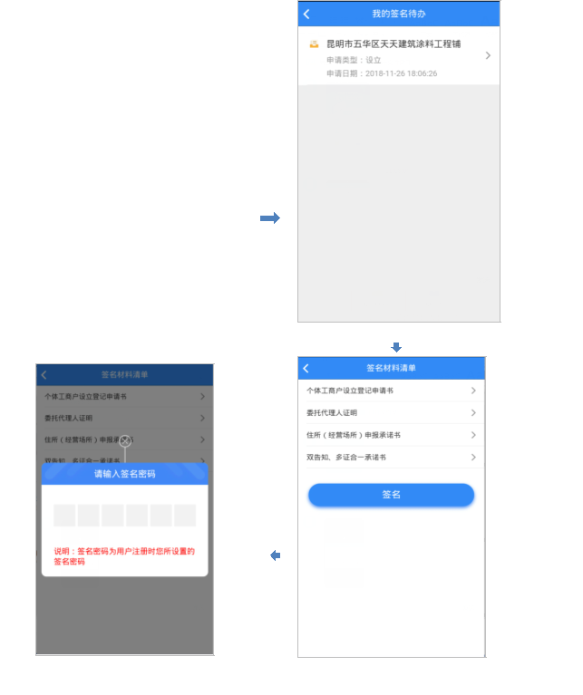 第十一步:申請(qǐng)人通過(guò)點(diǎn)擊首頁(yè)中的“我的簽名待辦”,進(jìn)入申請(qǐng)列表頁(yè)面。選擇具體申請(qǐng)后,申請(qǐng)人查看相關(guān)待簽名材料并點(diǎn)擊“簽名”,輸入簽名密碼后點(diǎn)擊“確認(rèn)”。如下圖: