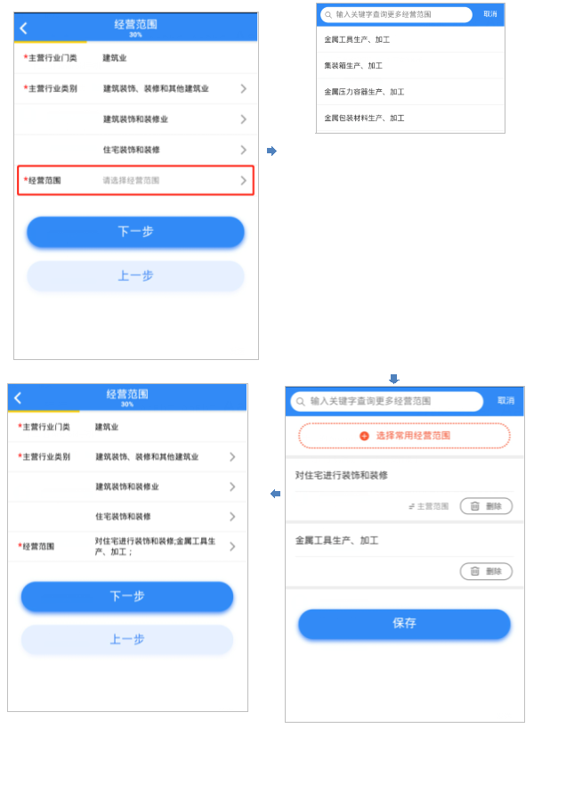 第六步:點(diǎn)擊“經(jīng)營(yíng)范圍”項(xiàng),輸入經(jīng)營(yíng)范圍關(guān)鍵字,查詢所需經(jīng)營(yíng)范圍,在結(jié)果清單中點(diǎn)擊某項(xiàng)經(jīng)營(yíng)范圍后,選中的第一項(xiàng)默認(rèn)為“主營(yíng)范圍”,若已選中的“主營(yíng)范圍”被刪除,則后續(xù)所選經(jīng)營(yíng)范圍會(huì)默認(rèn)設(shè)置為“主營(yíng)范圍”。