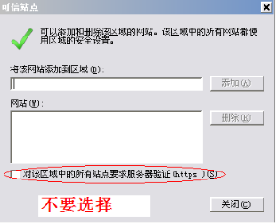 4)在信任站點中,點擊“站點”,將此訪問的地址添加進去。注意:不要將“對該區(qū)域中的所有站點要求服務器驗證(https:)”前面的復選框里面的對勾點中。如圖: