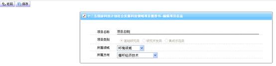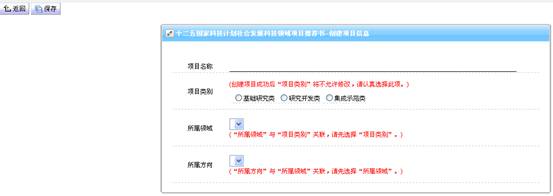 在上圖中輸入“項目名稱”,選擇“項目類別”、“所屬領(lǐng)域”、“所屬方向”,點擊按鈕“保存”,項目創(chuàng)建即可完成。
