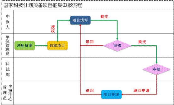 社會發(fā)展科技領(lǐng)域項目推薦書申報基本流程說明:首先要由單位管理員創(chuàng)建申報項目并授權(quán)給本單位申報用戶;申報用戶填寫完成并提交單位管理員后,由單位管理員對項目信息進(jìn)行審核,審核通過后可將提交至科技部。具體流程如下圖所示: