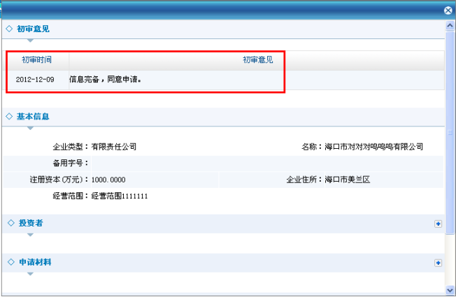3、 預審通過(表示工商局對該業(yè)務預審完畢且有預審意見反饋,點擊查看圖標可查看預審意見)