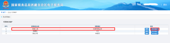 1.納稅人正常登陸西藏電子稅務局,在右上方單擊企業(yè)名稱(如圖),在系統(tǒng)彈出選擇項中點擊“企業(yè)人員維護”。