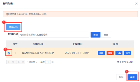 ①點(diǎn)擊“上傳材料”后,點(diǎn)擊“添加材料”,添加完材料后勾選相關(guān)材料,點(diǎn)擊“確定”