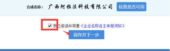 9、如果符合(具體請查看《企業(yè)名稱相同相近對比規(guī)則》、《企業(yè)名稱禁限用規(guī)則》),把“我已閱讀并同意《企業(yè)名稱自主申報須知》”的√打上,點擊保存并下一步。