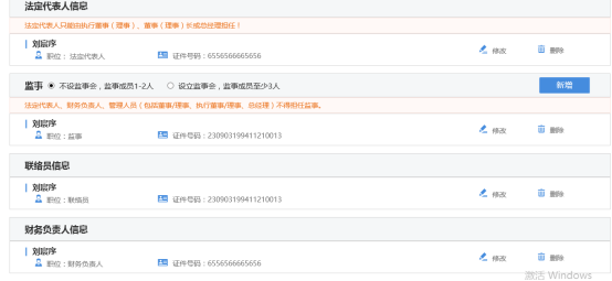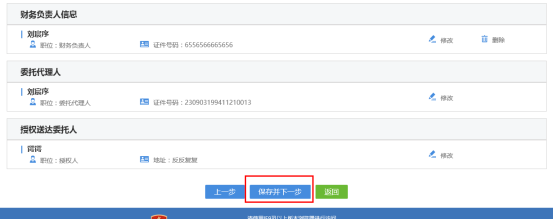 填寫企業(yè)人員信息,*號為必填項,點擊股東、董事、法定代表人、監(jiān)事信息的【新增】按鈕,填寫完畢點擊【保存并下一步】按鈕。