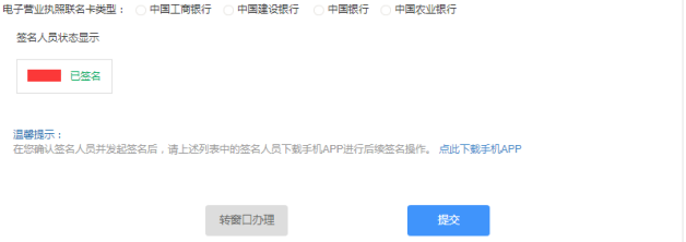? 申請人刷新登記申請頁面會看到 已簽名 字樣,待所有簽名人都完成電子簽名后,提交登記機(jī)關(guān)進(jìn)行登記核準(zhǔn)。(提交之前可以自主選擇銀行,申領(lǐng)電子營業(yè)執(zhí)照聯(lián)名卡)