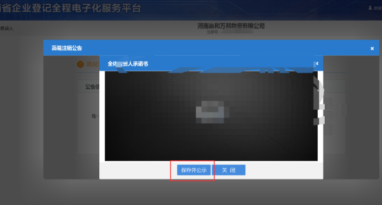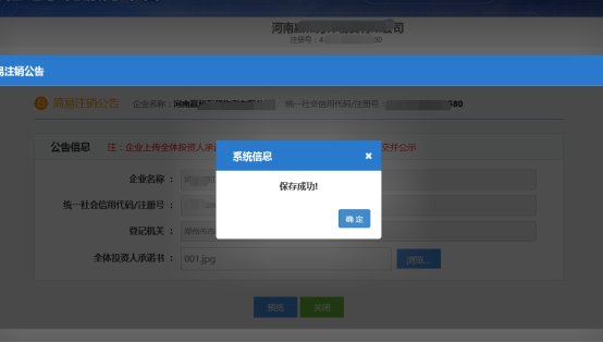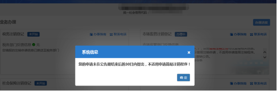 11.點擊保存并公示后,系統(tǒng)檢測到之前有超期未辦理的簡易注銷公告,點擊確定會將上次未辦理簡易注銷業(yè)務的公告置為無效,并給出保存成功提示。