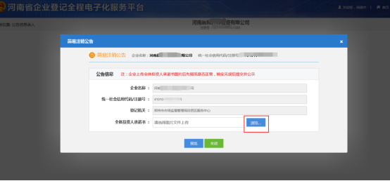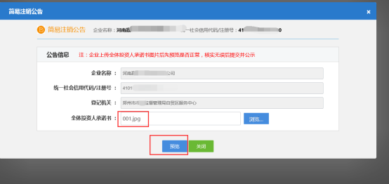 10.選擇要上傳的圖片,點擊預覽,發(fā)布債權人公告上傳圖片需要先預覽,確認無誤后點擊保存并公示,簡易注銷公告才會發(fā)布成功