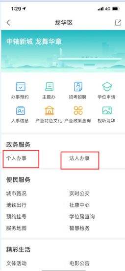三、在區(qū)級服務(wù)中找到龍華區(qū),點(diǎn)擊進(jìn)入, 可看到個人辦事和法人辦事兩大模塊: