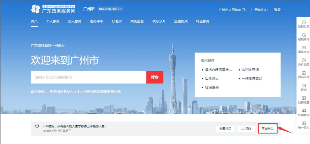 訪問廣東政務(wù)服務(wù)網(wǎng),點(diǎn)擊首頁里的市民網(wǎng)頁,如下圖: