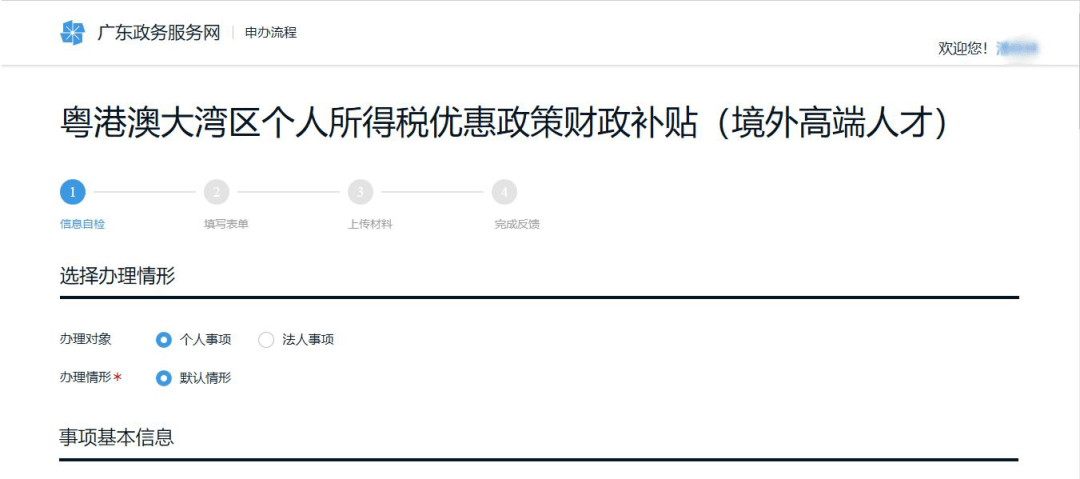 登錄后,進(jìn)入申辦流程,申辦流程環(huán)節(jié)包括 1、信息自檢——2、填寫表單——3、上傳材料——4、完成反饋