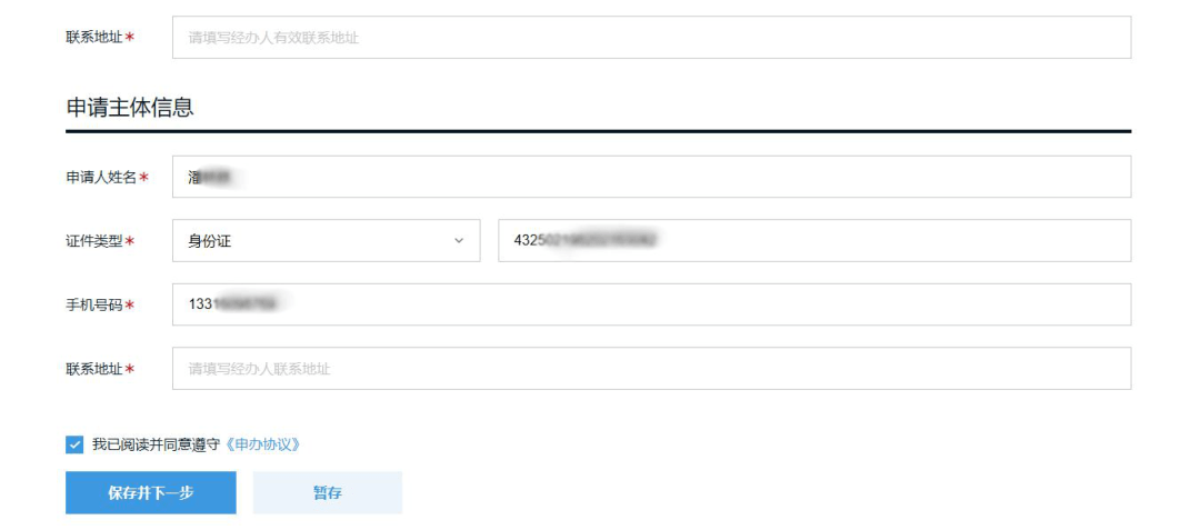 信息自檢頁,申請(qǐng)人對(duì)照要求是否有準(zhǔn)備好相關(guān)材料,并填寫經(jīng)辦人和申請(qǐng)主體信息的聯(lián)系地址