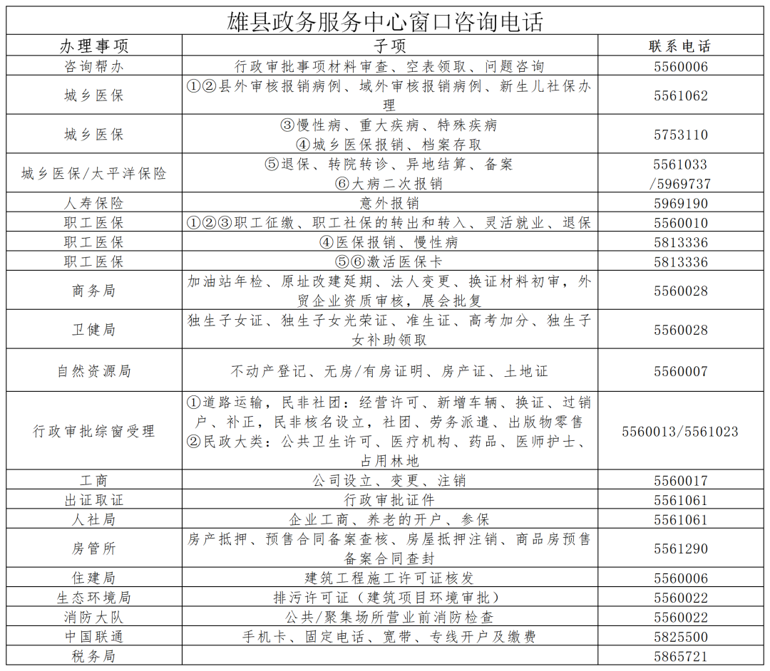 雄縣政務(wù)服務(wù)大廳各窗口聯(lián)系電話:
