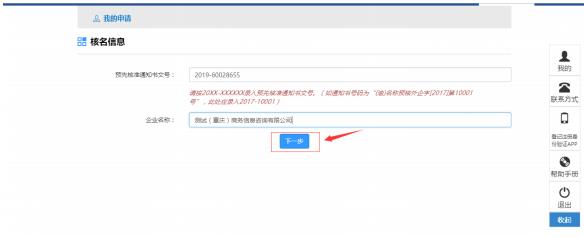 進(jìn)入【核名信息】校驗(yàn),按照提示準(zhǔn)確輸入《名稱預(yù)先核準(zhǔn)通知書》文號(hào)(或《告知書》文號(hào))和企業(yè)名稱。并點(diǎn)擊“下一步”。