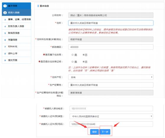 【基本信息】頁(yè)面中,部分內(nèi)容會(huì)根據(jù)名稱預(yù)先核準(zhǔn)申請(qǐng)時(shí)填報(bào)的信息由系統(tǒng)自動(dòng)填充,其余信息由申請(qǐng)人依次錄入,標(biāo)有★的項(xiàng)目為必錄項(xiàng)。錄入完成之后,點(diǎn)擊【保存】,待系統(tǒng)提示保存數(shù)據(jù)成功后,再點(diǎn)擊【下一步】。注意,本系統(tǒng)中每個(gè)頁(yè)面的信息錄入完畢后,均應(yīng)先點(diǎn)擊【保存】,再點(diǎn)擊【下一步】。