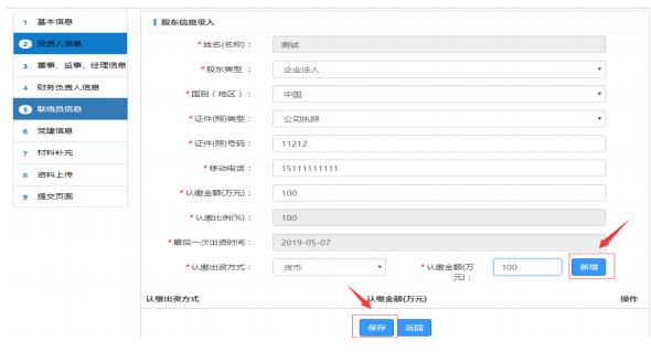 一個(gè)股東的出資若有多種出資方式,如貨幣、實(shí)物、房屋等,則需在【出資方式】后點(diǎn)擊【新增】,分次一一對(duì)應(yīng)錄入。