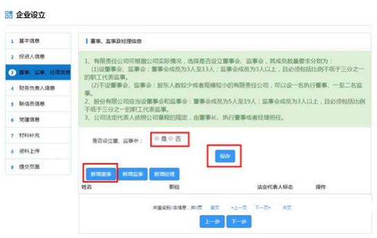【董事、監(jiān)事、經(jīng)理信息】頁(yè)面中,應(yīng)根據(jù)企業(yè)實(shí)際情況,先選擇是否設(shè)立董事會(huì)、監(jiān)事會(huì),并點(diǎn)擊【保存】,再錄入董事、監(jiān)事、經(jīng)理信息。