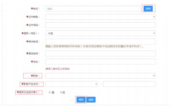 點(diǎn)擊【新增董事】按鈕,進(jìn)入董事信息錄入界面,填寫相關(guān)信息。若董事為公司股東,則可點(diǎn)擊【姓名】后面的【選擇】按鈕,進(jìn)行人員信息關(guān)聯(lián),將之前錄入的股東信息導(dǎo)入董事錄入框中。