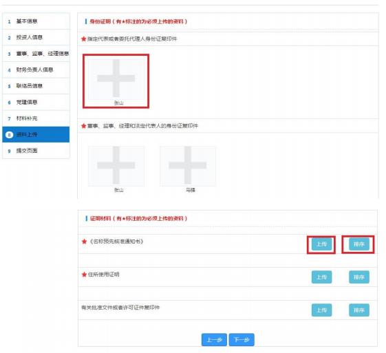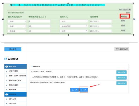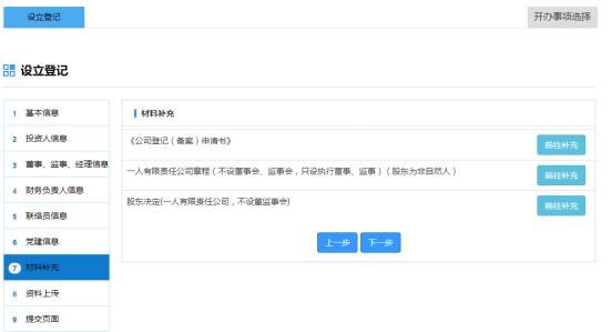 進(jìn)入【材料補(bǔ)充】頁(yè)面。該頁(yè)面的作用,是為下一步系統(tǒng)自動(dòng)生成申請(qǐng)表格、章程、各類決議等文書,補(bǔ)充相關(guān)內(nèi)容。