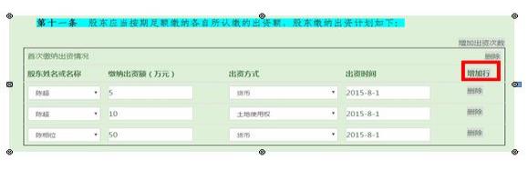 首先,填寫股東首次繳納出資情況,點(diǎn)擊【增加行】按鈕可增加不同股東的出資情況;本次未出資的股東,無(wú)需填寫;若一個(gè)股東有多種出資方式,比如貨幣、實(shí)物等,也應(yīng)通過(guò)【增加行】的方式逐條填寫。