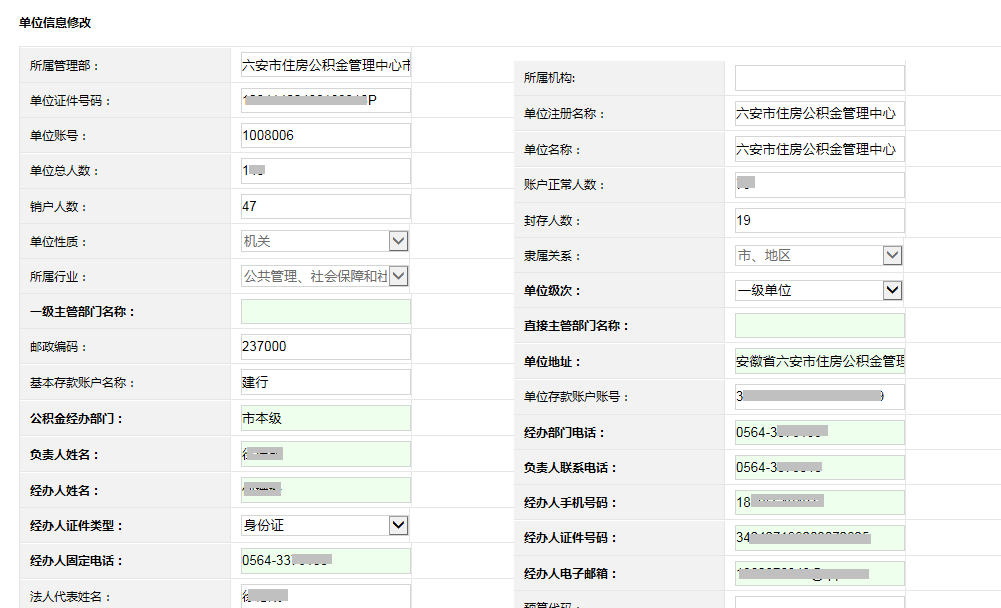 用于修改單位的基本信息,如單位地址、電話、經(jīng)辦人、郵箱等。頁面上淺綠色的內容可以修改,白色的單元格及灰色的下拉框內容不可以修改。
