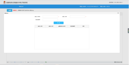 第三步:點擊“新增”按鈕,彈出綁定企業(yè)新增頁面,輸入納稅人識別號、納稅人名稱等查詢條件,點擊“下一步”按鈕,查詢出企業(yè)信息