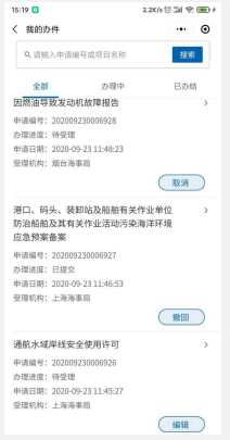 注:目前允許通過小程序在線辦理的事項(xiàng),才能在小程序進(jìn)行查看、編輯。當(dāng)前小程序支持在線辦理的事項(xiàng)有:“沿海水域劃定禁航區(qū)和安全作業(yè)區(qū)審批”、“通航水域岸線安全使用”、“不合規(guī)燃油信息報(bào)告”、“因燃油導(dǎo)致發(fā)動機(jī)故障報(bào)告”、“港口、碼頭、裝卸站及船舶有關(guān)作業(yè)單位防治船舶及其有關(guān)作業(yè)活動污染海洋環(huán)境應(yīng)急預(yù)案備案”這5個事項(xiàng)。