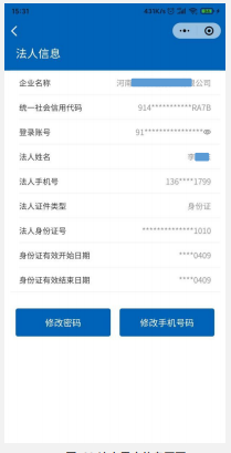 法人用戶登錄后,在個人中心頁面點(diǎn)擊“法人信息”跳轉(zhuǎn)到法人用戶信息頁面。法人用戶信息頁面顯示用戶基本信息,其中敏感信息會屏蔽展現(xiàn),還可以在當(dāng)前進(jìn)行修改密碼和修改手機(jī)號碼。如下圖所示。