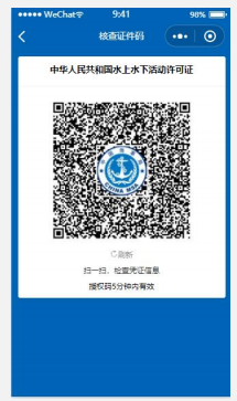 1. 亮證。在海事記過執(zhí)法人員檢查時,被檢查人員可以在亮證給執(zhí)法人員檢查?!按瑔T證照”可以點(diǎn)擊證照卡片上的二維碼圖標(biāo)跳轉(zhuǎn)到亮證頁面進(jìn)行亮證操作。如下圖所示。