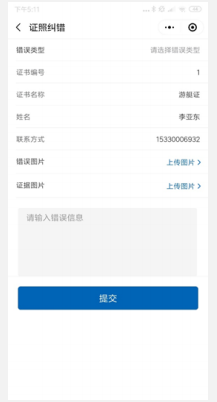 2. 證照糾錯?!按瑔T證照”還可以點(diǎn)擊證照卡片上的“糾錯”跳轉(zhuǎn)到證照糾錯頁面進(jìn)行證照信息糾錯。如下圖所示。