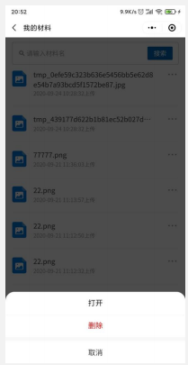 在我的材料頁面還可以上傳材料、刪除材料和查看材料。如下圖所示。